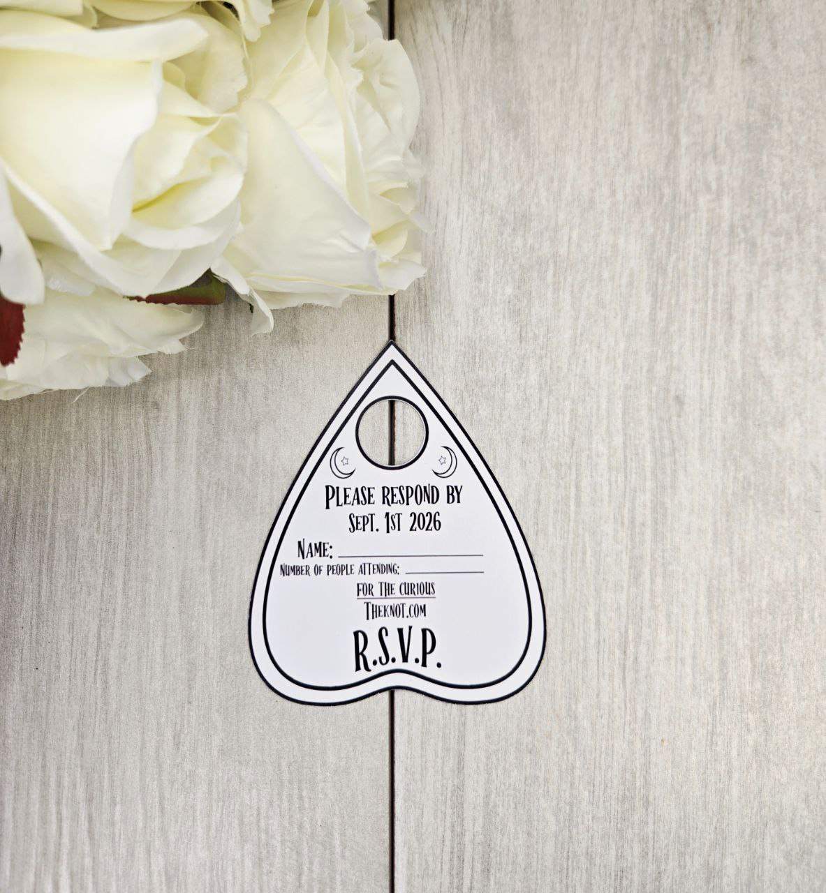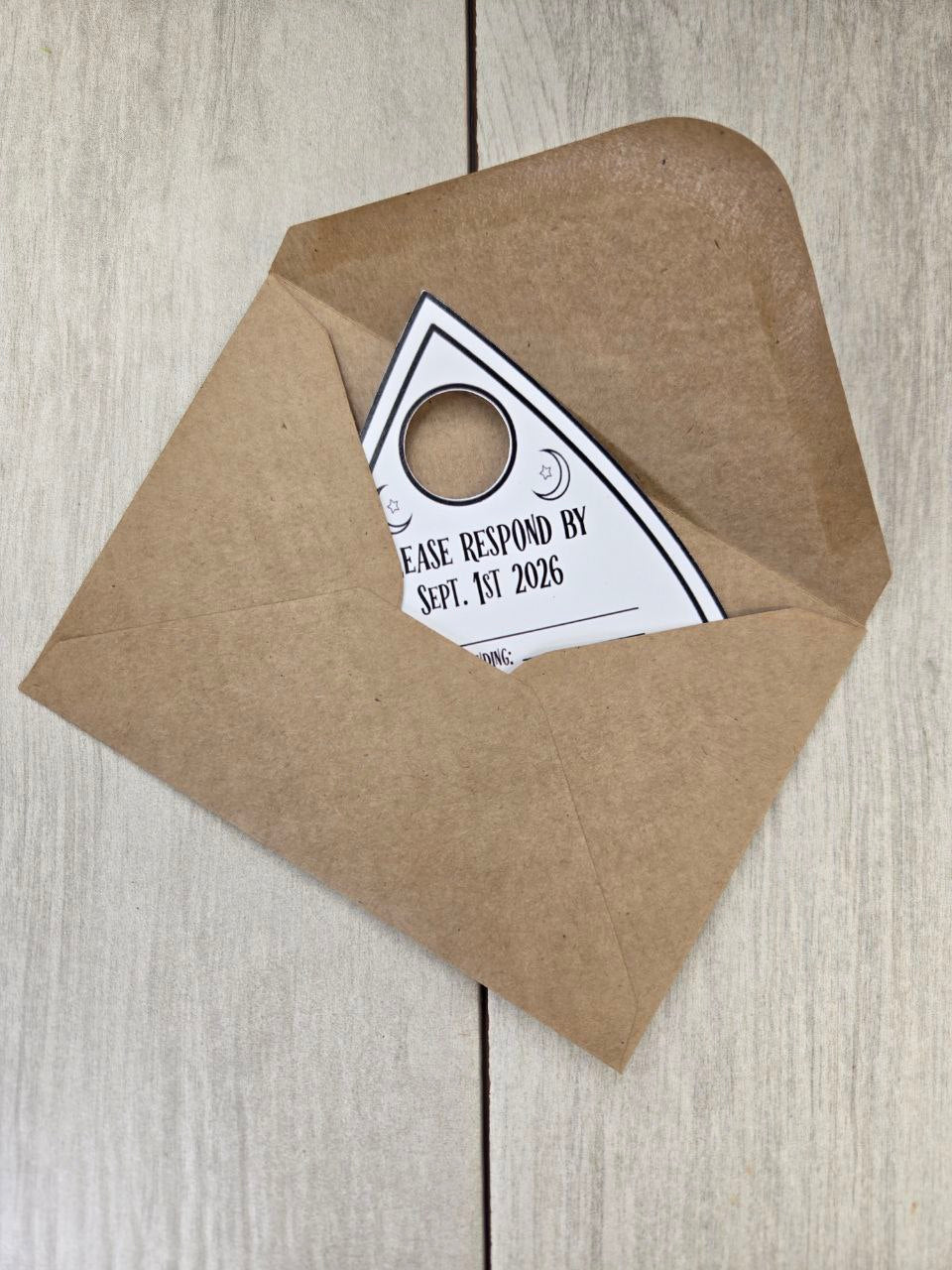 Coordinates perfectly with our wooden save the dates — choose from ouija board, planchette, or moon phase designs.
